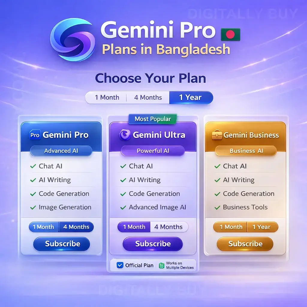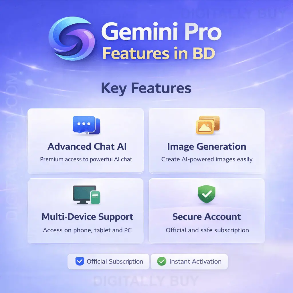 আজই কিনুন Gemini Pro buy BD এবং Google-এর সবচেয়ে শক্তিশালী AI tools ব্যবহার শুরু করুন।
