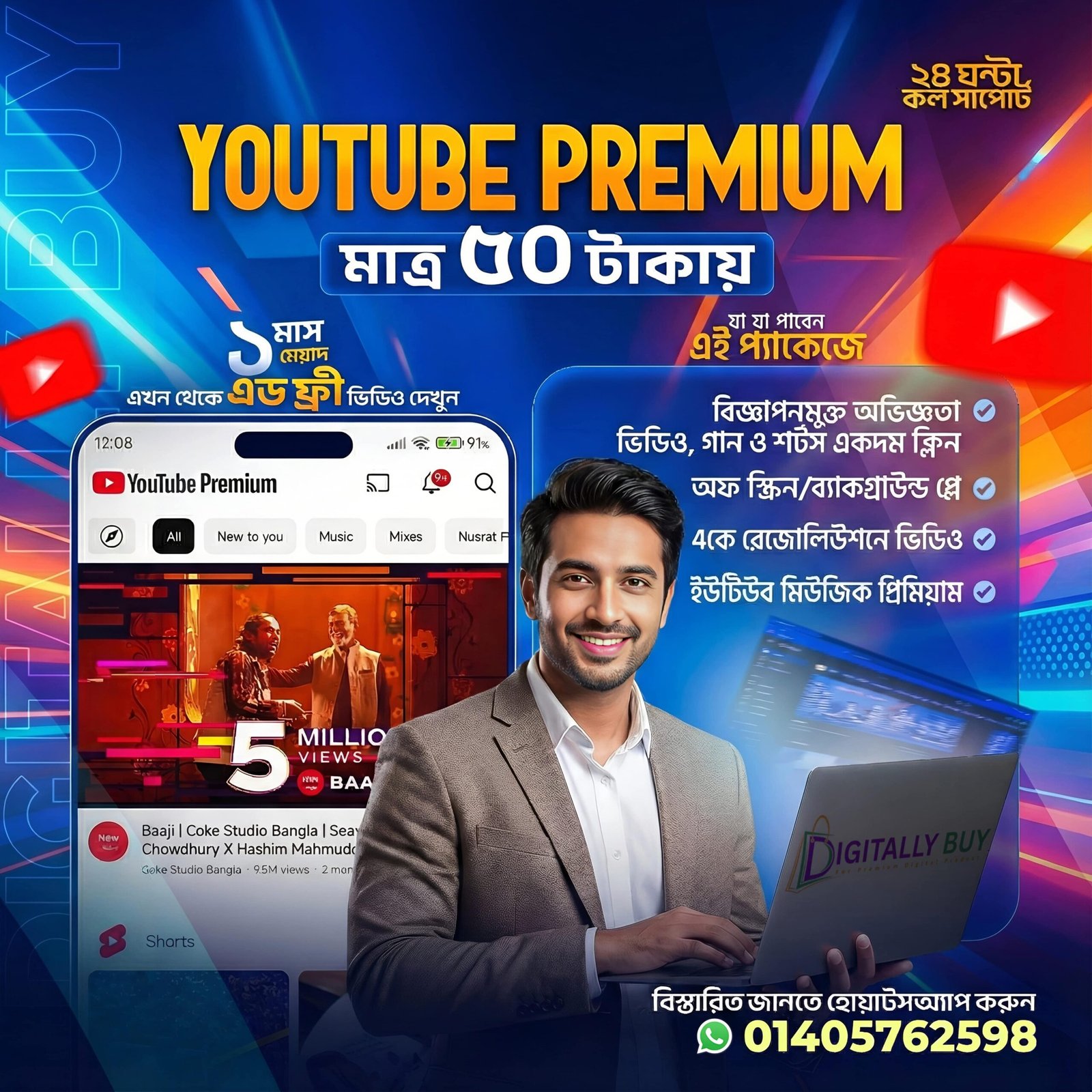 - 🎵 YouTube Music Premium Access – মিলিয়ন গান ফ্রি শুনুন